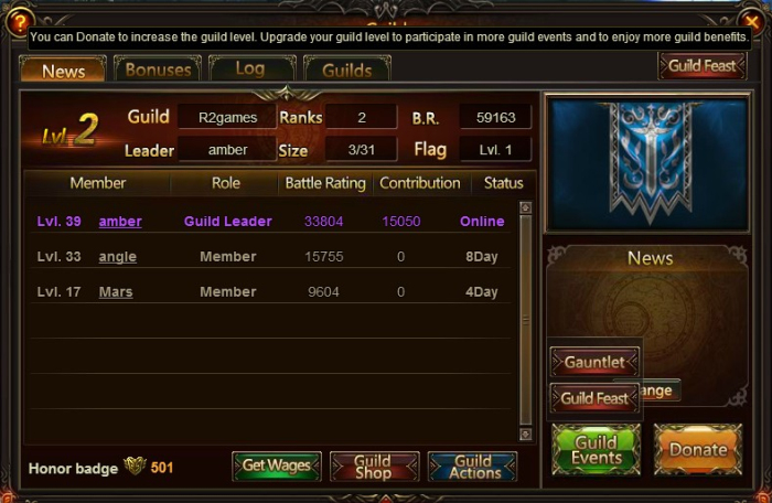 2. You will receive Honor Badges from donating to the guild, by joining guild events, and through your wages.
