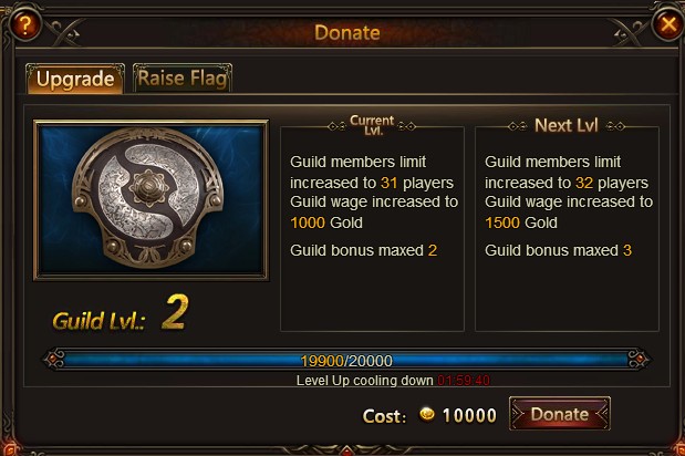 2. Upgrading guild level/flag influences your ranking among other guilds. Upgrade guild level to get the most out of your guild bonuses. Upgrade the guild flag to boost character stats.