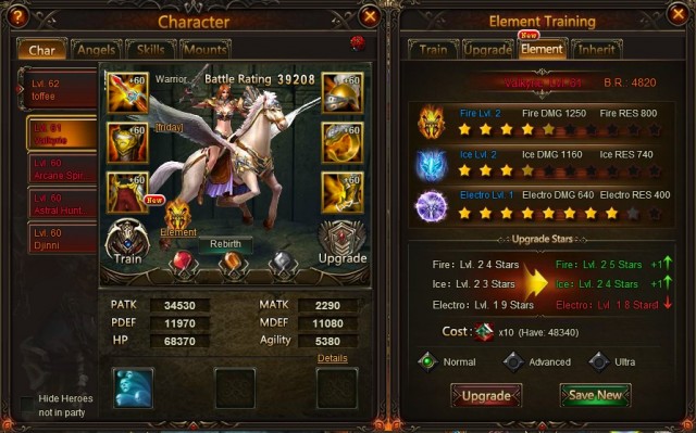 - Click on the Upgrade button in the Element panel to see the 3 element types fluctuate according to training mode you choose. Remember to click ‘Save’ to save stats you like before upgrading again!